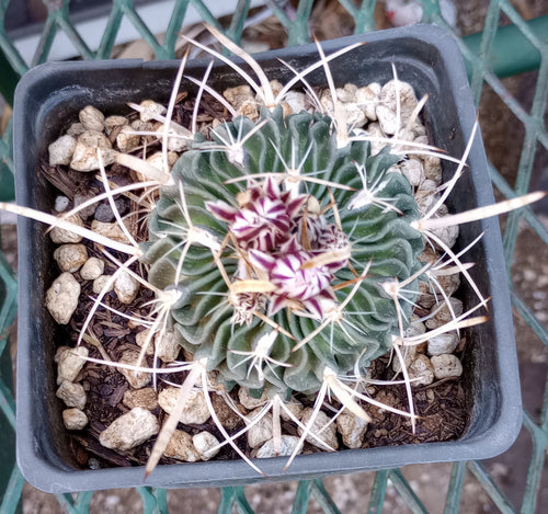 Stenocactus erectocentrus Curly Ribs Purple Striped Flowers in Winter Cactus